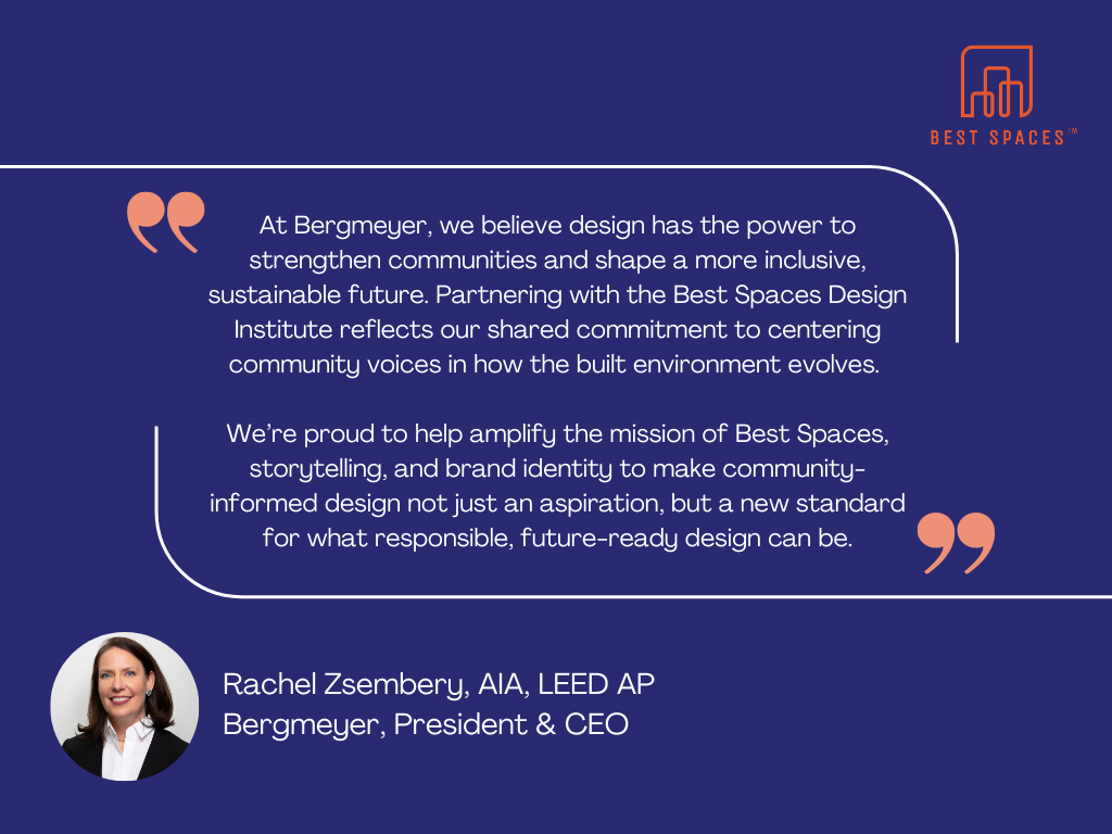 Bergmeyer is the Best Spaces Design Institute’s first-ever Founding Impact Partner, joining in October 2025. Together, the Best Spaces Design Institute and Bergmeyer are collaborating to elevate the branding, messaging, and story of Best Spaces v1, ensuring the program’s visual and narrative identity reflects its people-first and community-centered mission.